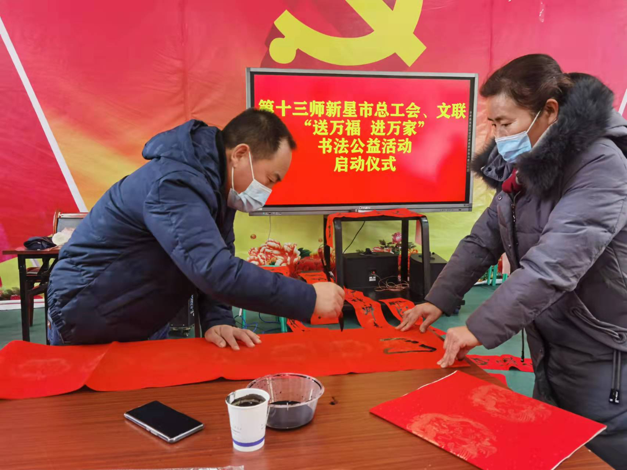 1月11日,新疆生產(chǎn)建設(shè)兵團(tuán)十三師新星市總工會聯(lián)合師市文聯(lián)開展的“送萬福、進(jìn)萬家”書法公益活動(dòng)正式啟動(dòng)。