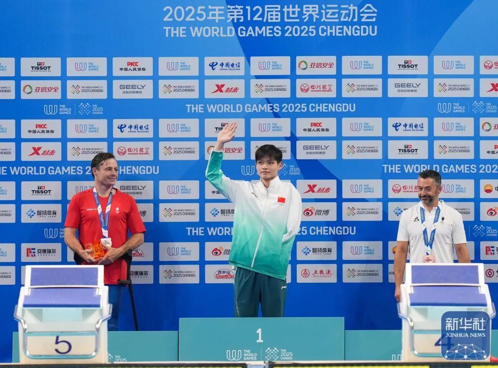 8月11日,中國隊選手在比賽后。當日,在2025年成都世運會女子4x50米水面蹼泳接力決賽中,中國隊以1分07秒99的成績奪得冠軍并創(chuàng)造新的世界紀錄。新華社記者 王曦 攝