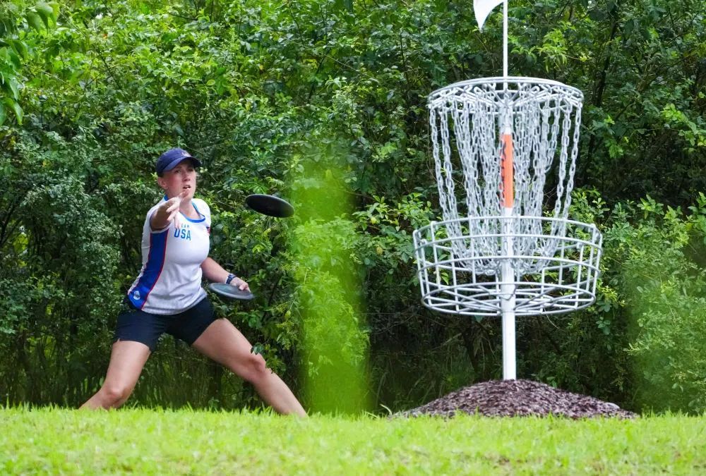 8月10日,美國隊選手甘農(nóng)在桂溪生態(tài)公園進行的擲準飛盤混合雙人決賽中。 新華社記者 陳欣波 攝