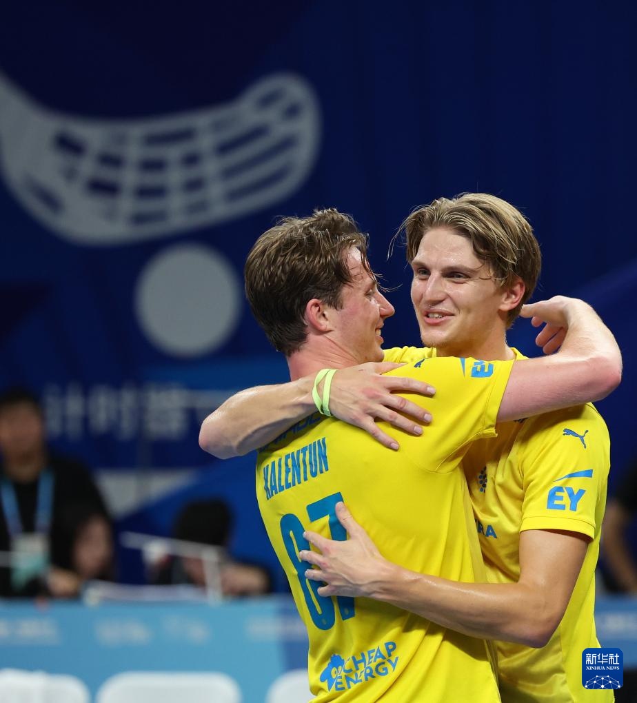 8月13日,瑞典隊球員埃米爾(左)與隊友慶祝奪冠。新華社記者 梁旭 攝