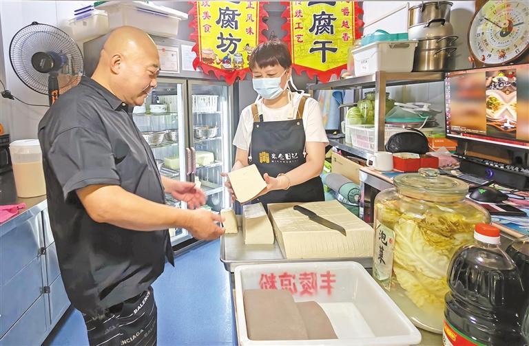 8月13日,在位于西安市蓮湖區(qū)北院門街道的洛鄉(xiāng)情豆腐坊,顧客在購買洛南豆腐。陜西日報記者 鄭斐 攝