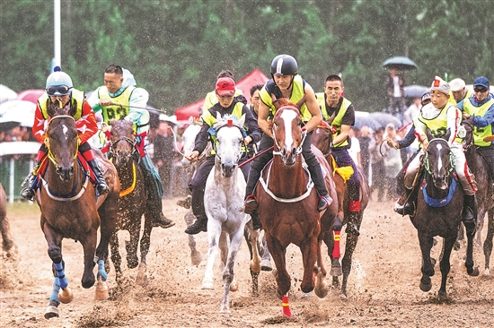 8月8日,2025興安盟那達慕在內(nèi)蒙古興安盟科爾沁右翼前旗烏蘭毛都蘇木開幕。圖為速度賽馬比賽。新華社記者 馬金瑞 攝