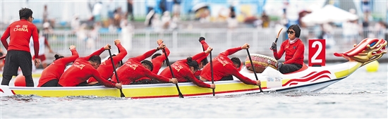 中國隊在龍舟8人座公開組2000米追逐賽決賽中。新華社記者 李嘉南 攝