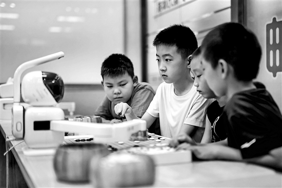 8月10日,小朋友在天津?yàn)I海文化中心與機(jī)器人下圍棋。