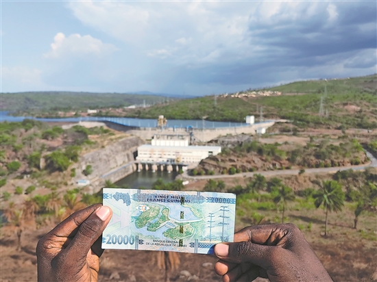 這是以凱樂(lè)塔水電站為背景拍攝的印著水電站的2萬(wàn)幾內(nèi)亞法郎紙幣。新華社發(fā)(中國(guó)水利電力對(duì)外有限公司供圖)