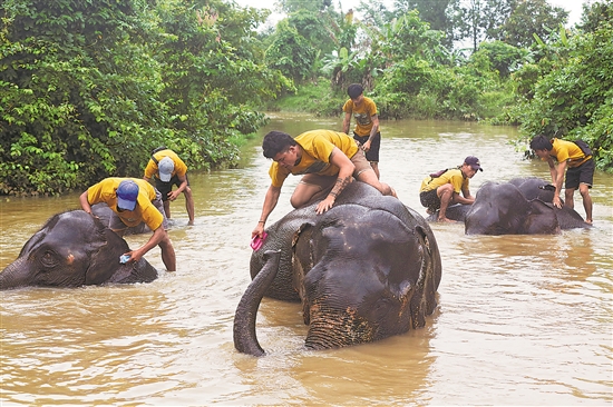 8月12日,在緬甸勃固省的溫加波大象營地內,工作人員幫助大象洗澡。當日是世界大象日。位于緬甸勃固省的溫加波大象營地建于2016年,致力于救助和收養(yǎng)大象“孤兒”。新華社發(fā) (苗覺梭 攝)