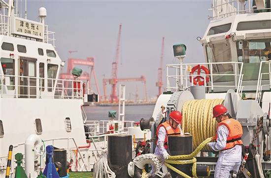 當日,由4艘純電動港作拖輪組成的“綠色艦隊”在中船天津碼頭鳴笛啟航。