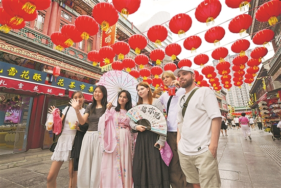 當日,2025“漢語橋”天津師范大學“上合之約”學生中文交流營在天津古文化街舉行探訪活動,來自俄羅斯、哈薩克斯坦、烏茲別克斯坦等上合國家的100名青年學子走進古街,感受中國傳統(tǒng)文化魅力。新華社記者 李然 攝