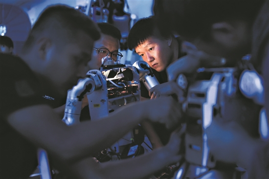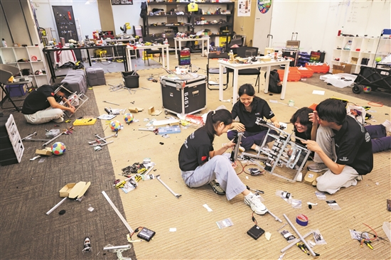 8月7日,北京市十一學(xué)校的高中生正在設(shè)計和組裝機器人。作為高中生,他們?yōu)槟芤娮C和參加首屆世界人形機器人運動會深感榮幸。
