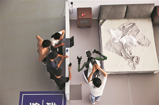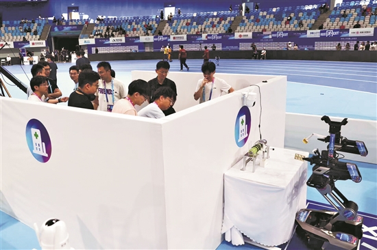 8月4日,參加場景賽的參賽隊正在“酒店客房”調(diào)試機器人,讓其在比賽中可以更加精準高效。