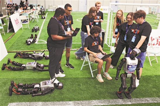 8月4日,參加人形機器人足球賽的外國參賽隊正在調(diào)試機器人。