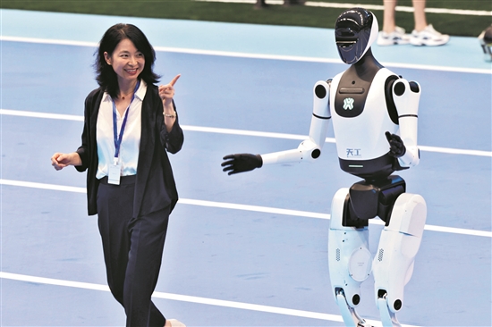 8月14日,2025世界人形機器人運動會開幕式前,一名女士與人形機器人進行互動。