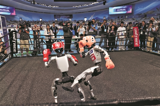 8月15日,在外圍賽自由搏擊賽項,奧林1隊(圖左)與北科武大聯(lián)隊的人形機器人在比賽中。